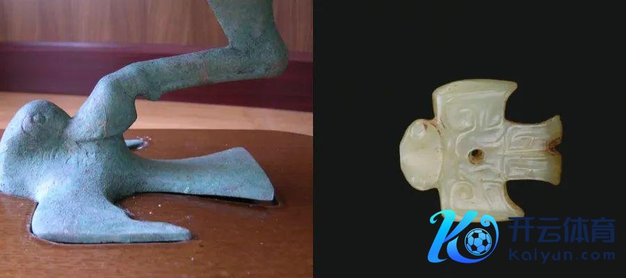 铜奔马复刻品细节与燕形玉佩对比。马蹄下的鸟尾呈楔形,而燕子的尾羽是典型的叉形,即全球熟知的“燕尾”(图片来源:Wikimedia Commons & openmuseum)