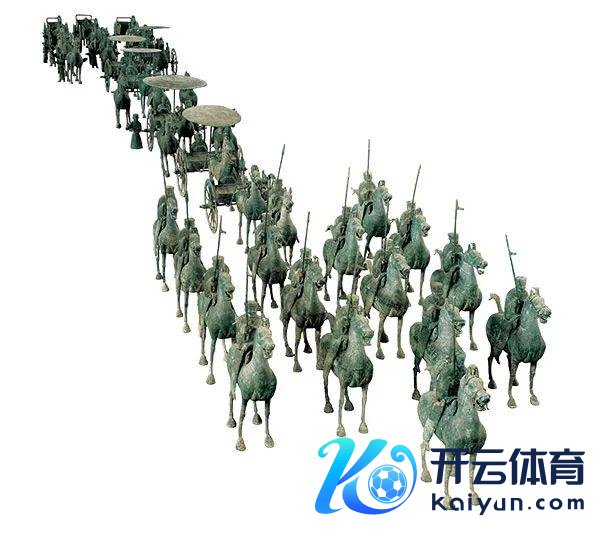 铜奔马其实是一支巨大的“仪仗队”中的一部分:这是由 39 匹铜马、1 头铜牛、1 辆斧车、4 辆轺车、3 辆辇车、3 辆“大车”、2 辆“小车”、1 辆牛车、17 个手持戟矛的武士俑和 28 个跟从俑构成的。