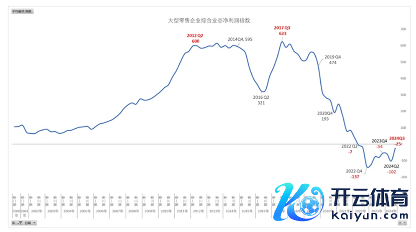 其实,以线下为主的大型零卖企业收入拐点早也曾出当今2018年,而后步入下行周期之中,2023年转为负增长。而利润拐点时候更早,出当今2017年第三季度,而后增速约束鬈曲下滑,到2022年第二季度出现亏蚀,而后再未回到正盈利景象了。