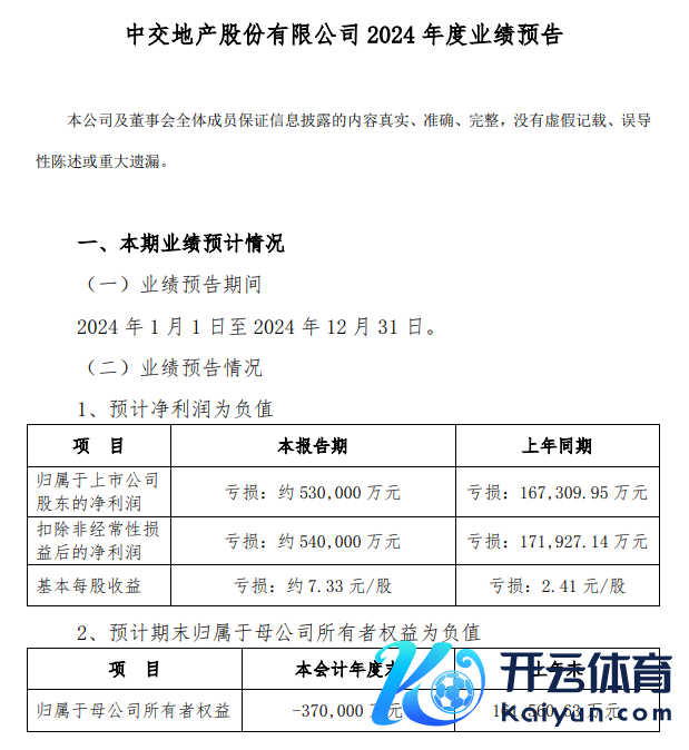 1月21日晚间,中交地产发布2024年度功绩预报炫耀,预测2024年净损失约53亿元,上年同时净损失16.73亿元。预测2024年度期末公司归母净钞票为负,公司股票往来可能被奉行退市风险警示。