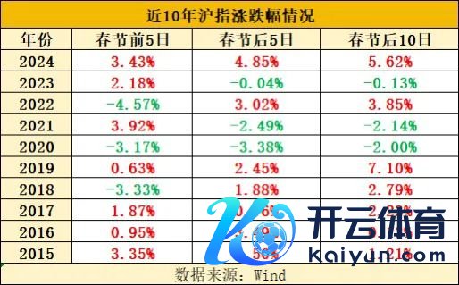 具体来看,2015至2024年间,春节前、后5个交游日以及春节后10个交游日内,沪指累计飞腾的年份辞别有7年,即春节前、后5个交游日以及春节后10个交游日内沪指飞腾概率均为70%。
