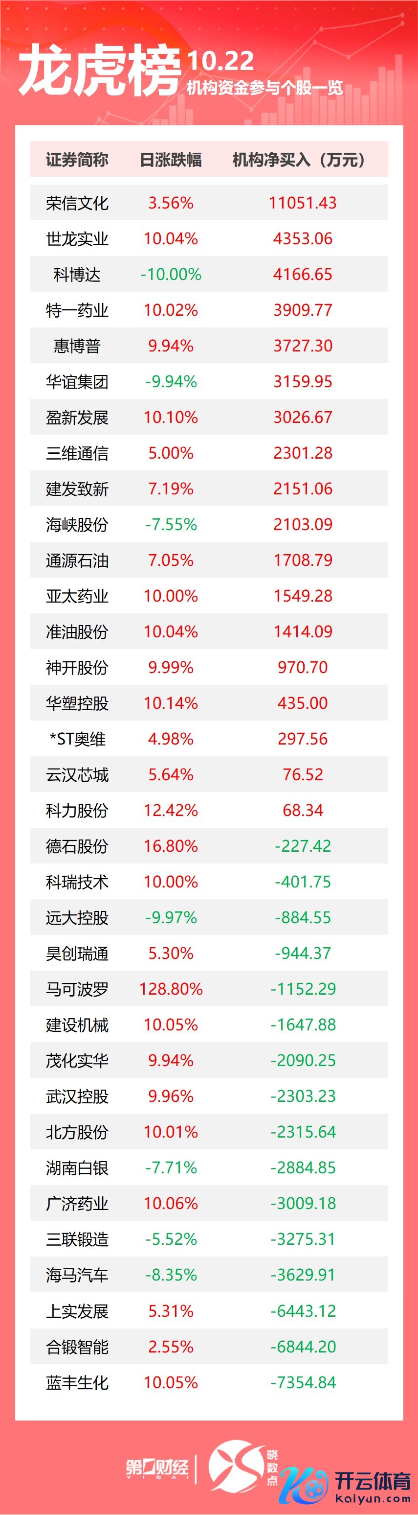 10月22日龙虎榜中,共34只个股出现了机构的身影,18只股票呈现机构净买入,16只股票呈现机构净卖出。当天机构净买入前三的股票别离是荣信文化、世龙实业、科博达;当天机构净卖出前三的股票别离是蓝丰生化、合锻智能、上实发展。